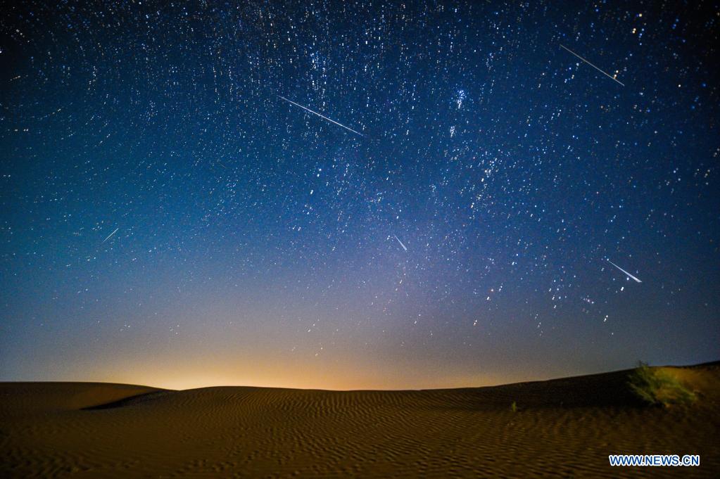 E-mail Xinhua, August 14, 2021Photomontage taken on Aug. 13, 2021 shows the night sky during the Perseid Meteor Shower above an ecological demonstration zone of Engebei in Kubuqi Desert, north China's Inner Mongolia Autonomous Region. (Xinhua/Ren Junchuan)