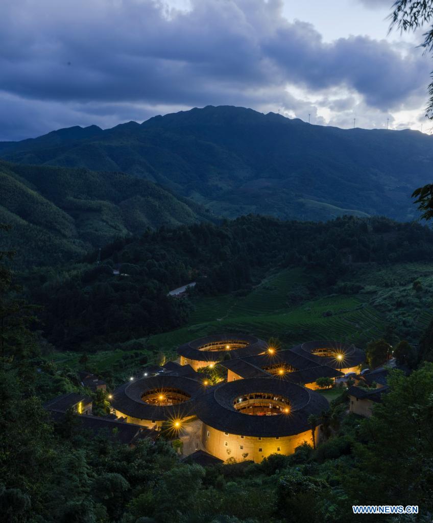 E-mail Xinhua, August 19, 2021Photo taken on Aug. 16, 2021 shows Tianluokeng Tulou cluster in Nanjing County, southeast China's Fujian Province. Relying on Tulou, the unique residential architecture of Fujian Province which was inscribed on the UNESCO's World Heritage List in 2008, Nanjing County has found a sustainable way to develop the rural tourism industry and boost the local economy. (Xinhua/Song Weiwei)