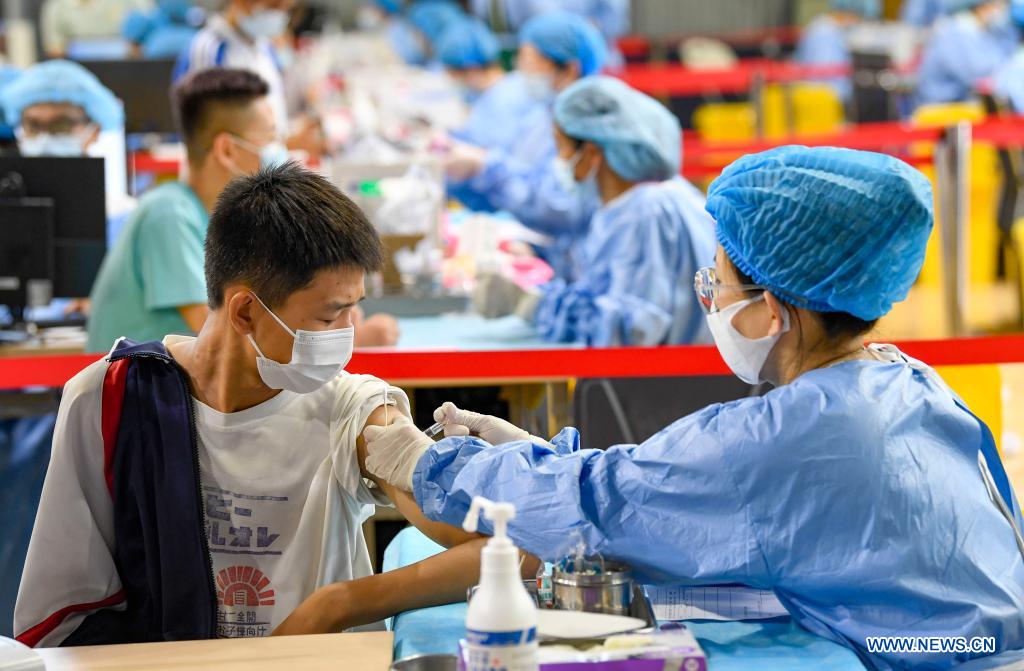 E-mail Xinhua, August 19, 2021A student receives a dose of COVID-19 vaccine at a vaccination site in Yinchuan, capital city of northwest China's Ningxia Hui Autonomous Region, Aug. 18, 2021. Ningxia on Wednesday started to administer vaccines to teenagers aged between 12 and 14. (Xinhua/Feng Kaihua)