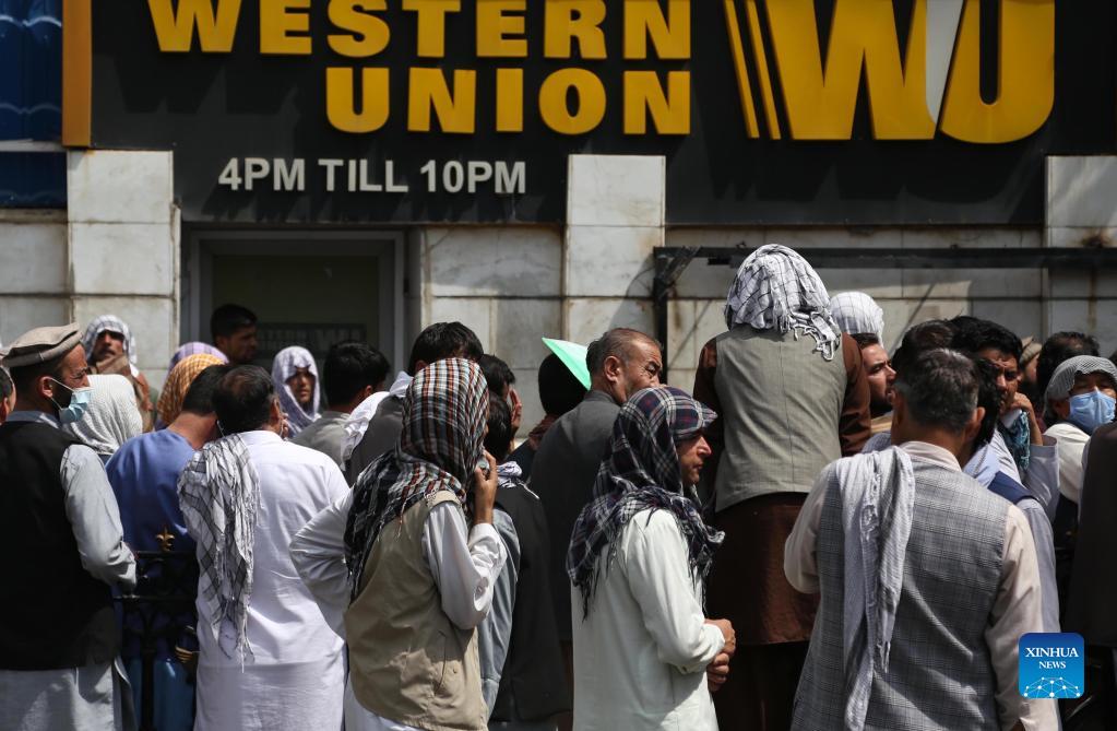 People line up in front of a bank in Kabul, capital of Afghanistan, Aug. 31, 2021. [Photo by Kabir/Xinhua]
