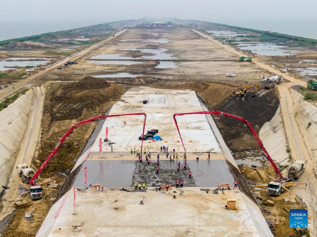 E-mail Xinhua, September 6, 2021Aerial photo taken on Sept. 5, 2021 shows the construction site of Nanquan section of Taihu tunnel, part of the Changzhou-Wuxi Highway, in Wuxi, east China's Jiangsu Province. The main construction of the Nanquan section of the Taihu tunnel was completed on Sunday. Taihu tunnel, China's longest underwater highway tunnel, is part of the Changzhou-Wuxi Highway which has a total length of 43.9 km. The 10.8-km-long, 43.6-meter-wide tunnel is under Taihu Lake, China's third-largest freshwater lake. (Xinhua/Li Bo)