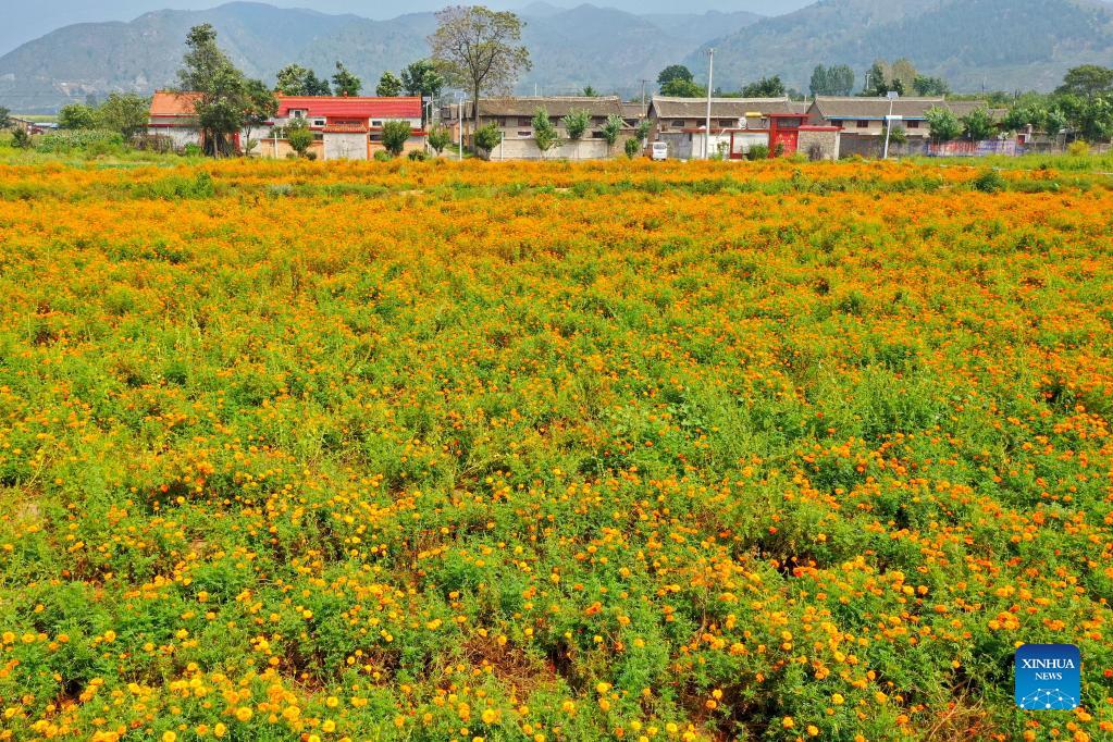 Aerial photo taken on Sept. 14, 2021 shows marigolds to be harvested in Yuanqu County of Yuncheng City, north China's Shanxi Province. (Xinhua/Cao Yang)