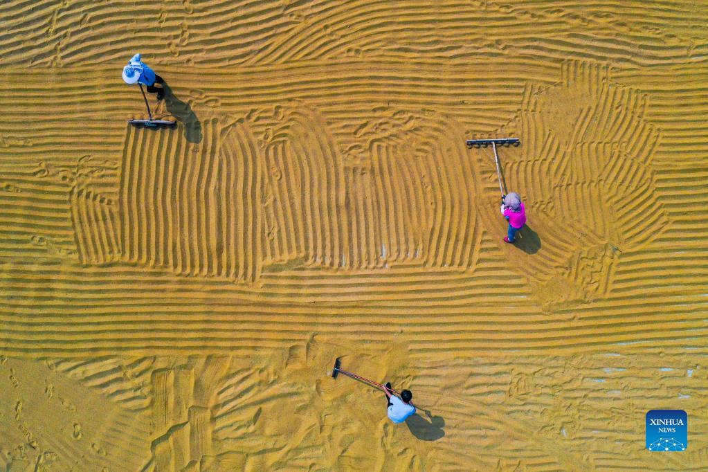 Aerial photo taken on Sept. 14, 2021 shows villagers drying millet in Yuanqu County of Yuncheng City, north China's Shanxi Province. (Xinhua/Cao Yang)
