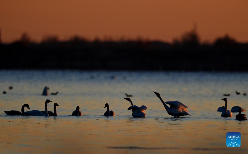 E-mail Xinhua, November 2, 2021Swans are seen at the Hekou Reservoir wetland in Yulin, northwest China's Shaanxi Province, Oct. 31, 2021. To the south of the Maowusu Desert, the Yuyang District has witnessed improvement in eco-environment thanks to decades of afforestation efforts. [Photo by Tao Ming/Xinhua]