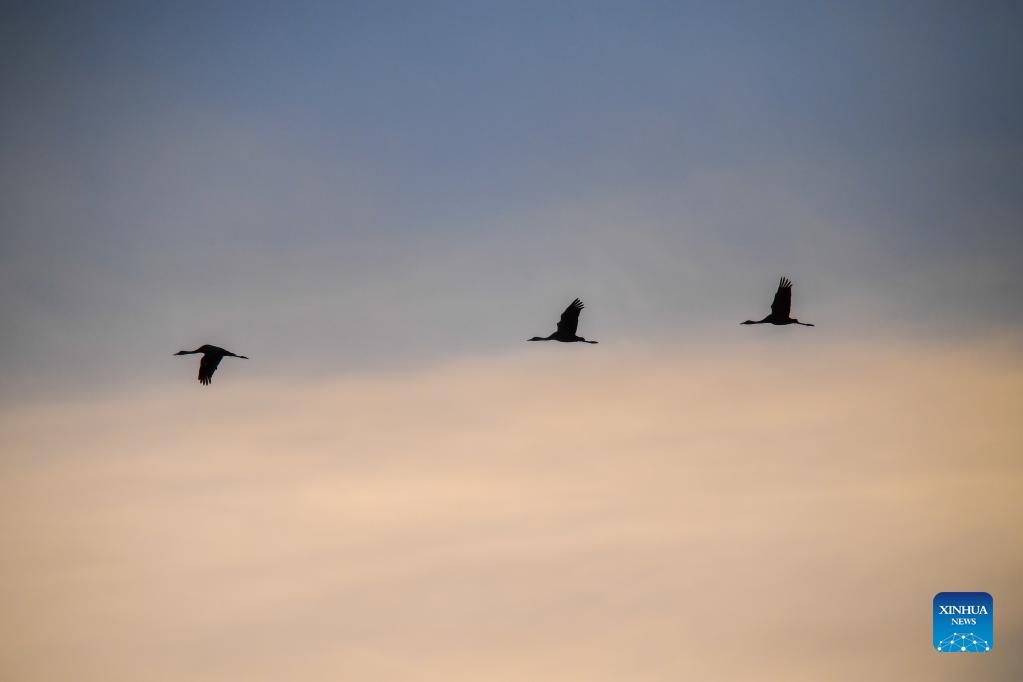 Migrant birds fly over Momoge National Nature Reserve in Zhenlai County, Baicheng City of northeast China's Jilin Province, Nov. 3, 2021. [Photo by Zhang Nan/Xinhua]