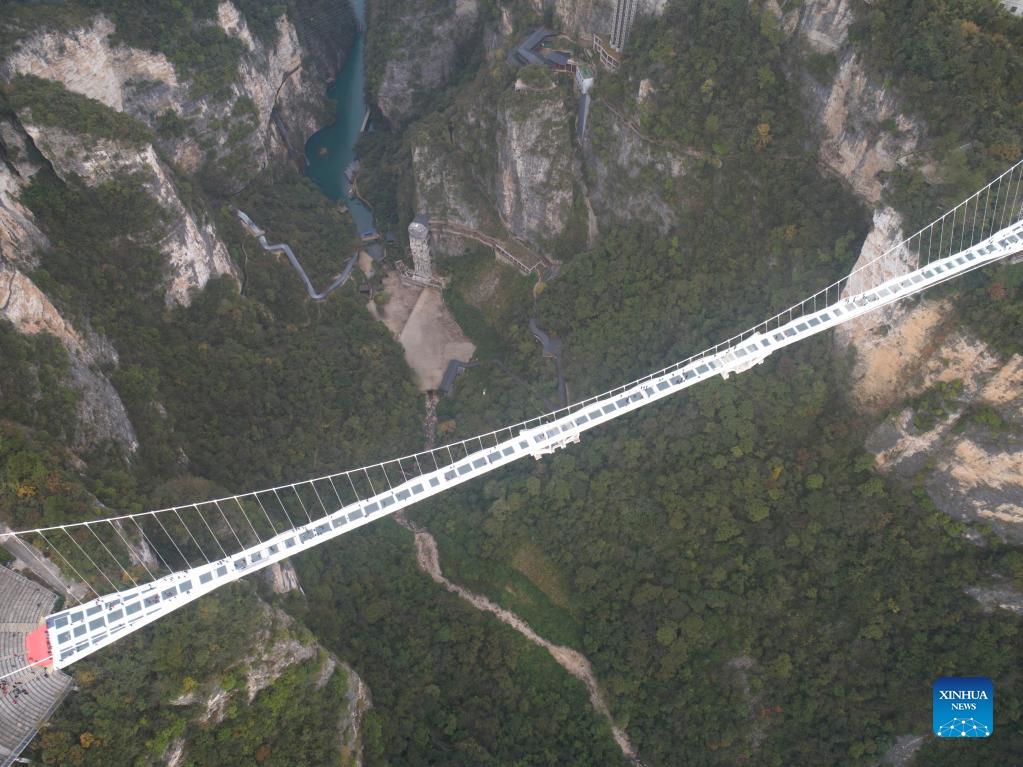 E-mail Xinhua, November 13, 2021Aerial photo taken on Nov. 12, 2021 shows tourists playing on Zhangjiajie Grand Canyon's glass-bottomed bridge, central China's Hunan Province. The 430-meter long, six-meter wide bridge, linking two steep cliffs 300 meters above the ground, is paved with 99 panes of three-layer transparent glass. [Photo/Xinhua]