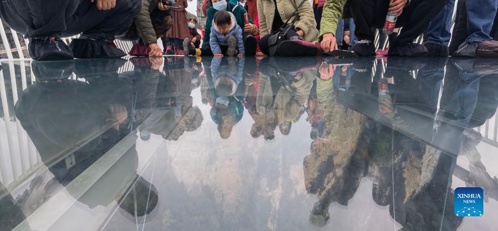 E-mail Xinhua, November 13, 2021Tourists look through a glass-bottomed bridge at Zhangjiajie Grand Canyon, central China's Hunan Province, on Nov. 12, 2021. The 430-meter long, six-meter wide bridge, linking two steep cliffs 300 meters above the ground, is paved with 99 panes of three-layer transparent glass. [Photo/Xinhua]