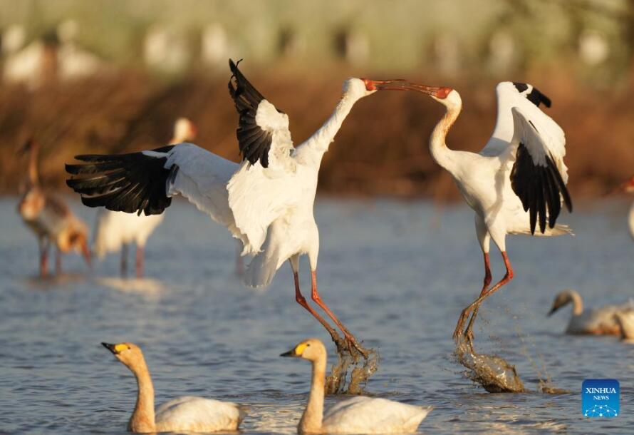 White cranes are seen at the Wuxing white crane conservation area by the Poyang Lake in Nanchang, east China's Jiangxi Province, Nov. 30, 2021. Numerous migratory birds including white cranes and swans have arrived in the wetland by the Poyang Lake, taking it as their winter habitat. [Photo by Zhou Mi/Xinhua]