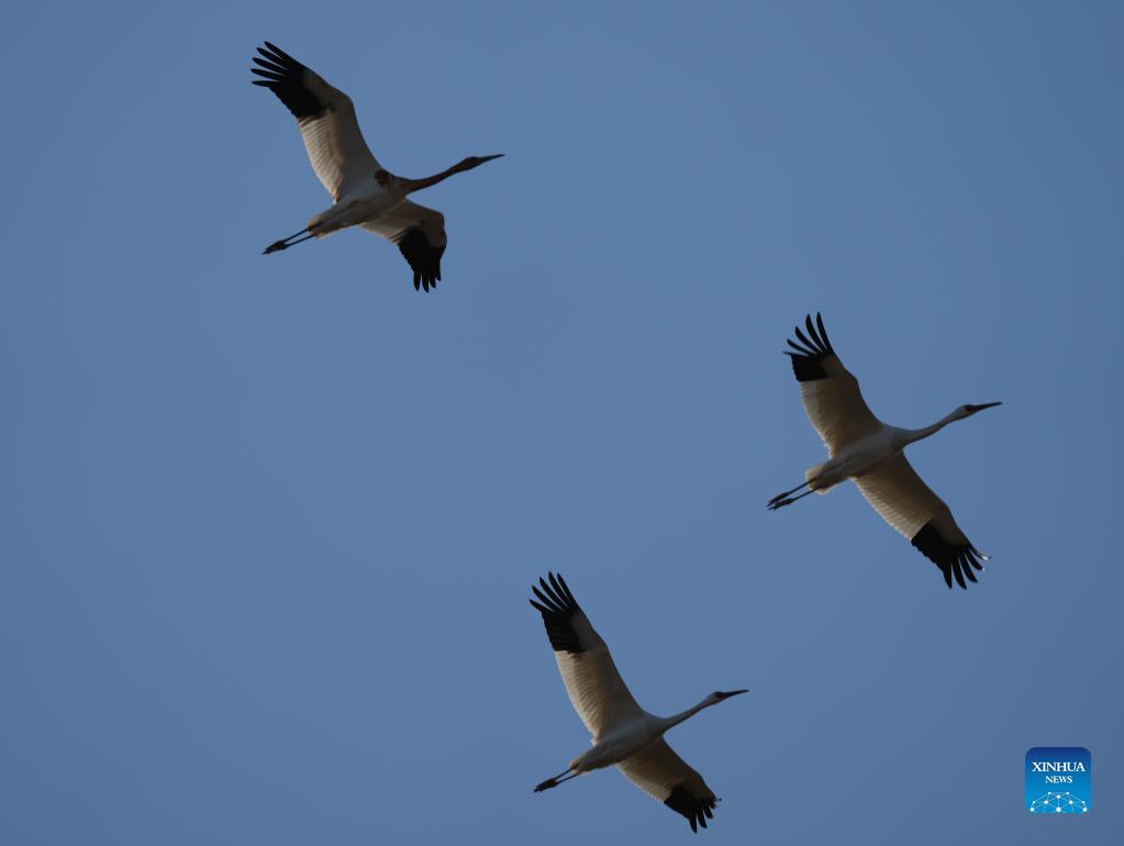 E-mail Xinhua, December 1, 2021A flock of white cranes fly over the Wuxing white crane conservation area by the Poyang Lake in Nanchang, east China's Jiangxi Province, Nov. 30, 2021. Numerous migratory birds including white cranes and swans have arrived in the wetland by the Poyang Lake, taking it as their winter habitat. [Photo by Zhou Mi/Xinhua]