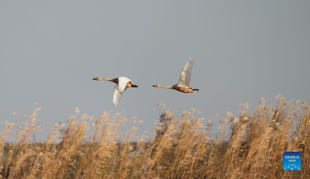 E-mail Xinhua, December 1, 2021Two swans fly over the Wuxing white crane conservation area by the Poyang Lake in Nanchang, east China's Jiangxi Province, Nov. 30, 2021. Numerous migratory birds including white cranes and swans have arrived in the wetland by the Poyang Lake, taking it as their winter habitat. [Photo by Zhou Mi/Xinhua]