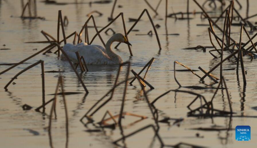 E-mail Xinhua, December 1, 2021A swan is seen at the Wuxing white crane conservation area by the Poyang Lake in Nanchang, east China's Jiangxi Province, Nov. 30, 2021. Numerous migratory birds including white cranes and swans have arrived in the wetland by the Poyang Lake, taking it as their winter habitat. [Photo by Zhou Mi/Xinhua]