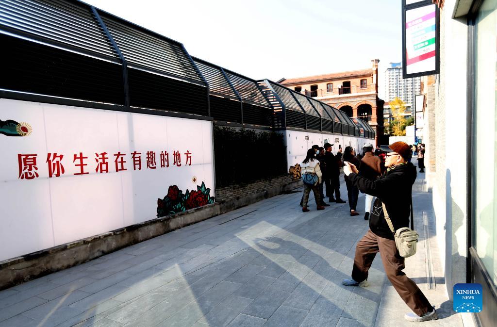 A resident takes pictures at an alley during an art season in east China's Shanghai, Dec. 4, 2021. (Xinhua/Ren Long)