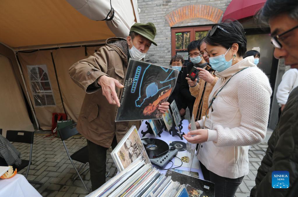 Residents buy vinyl discs at an alley during an art season in east China's Shanghai, Dec. 4, 2021. (Xinhua/Ren Long)