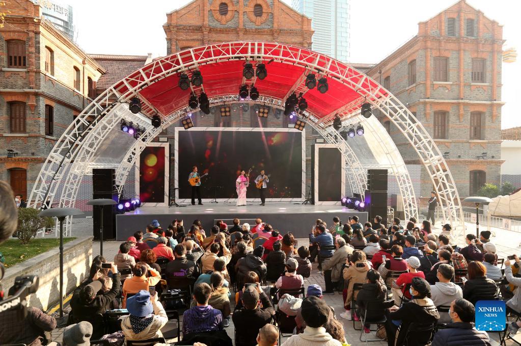 Residents enjoy a concert at an alley during an art season in east China's Shanghai, Dec. 4, 2021. (Xinhua/Ren Long)