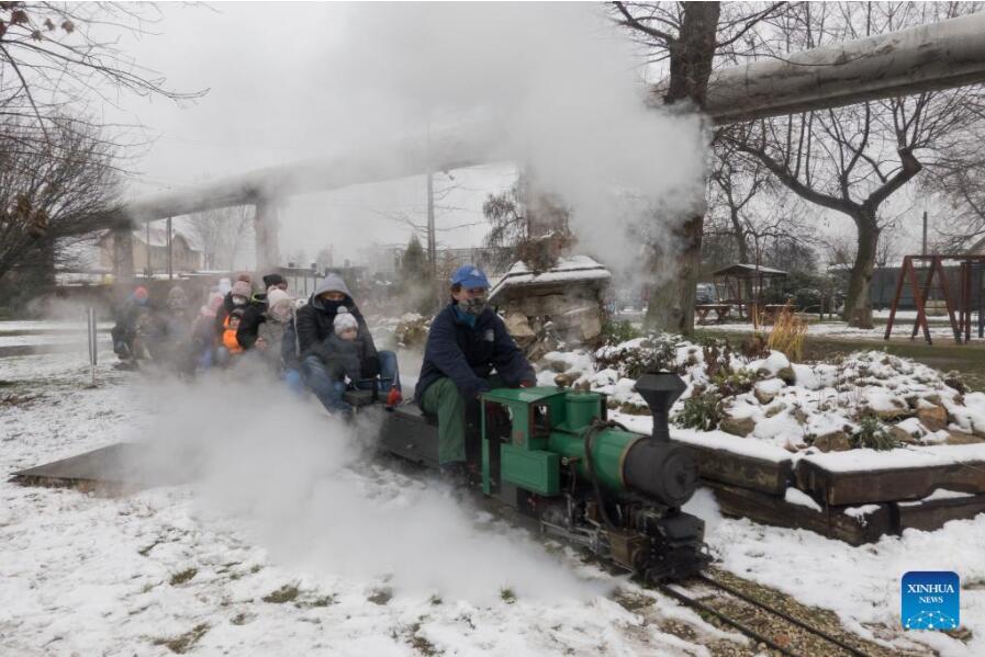 People ride on miniature train carriages amid the first snow among the Santa Celebrations in Hungarian Railway Museum in Budapest, Hungary, Dec. 5, 2021. [Photo by Attila Volgyi/Xinhua]