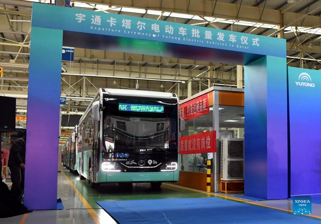 An e-bus produced by Yutong is seen during the departure ceremony of Yutong electric vehicles to Qatar in Zhengzhou, central China's Henan Province, Dec. 17, 2021. The departure ceremony of Yutong electric vehicles to Qatar was held in Zhengzhou on Friday. A total of 741 electric vehicles will be transported by sea to Qatar for the Qatar FIFA World Cup 2022. (Xinhua/Li Jianan)