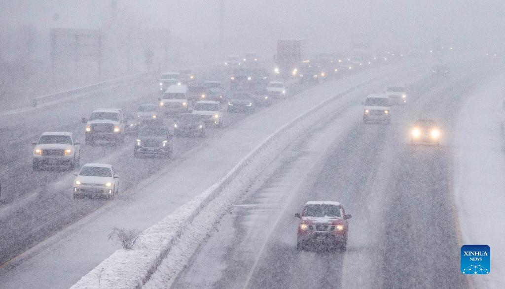 Vehicles are seen on Highway 403 during a snowy day in Mississauga, the Greater Toronto Area, Canada, on Dec. 18, 2021. A snowfall hit the Greater Toronto Area on Saturday.