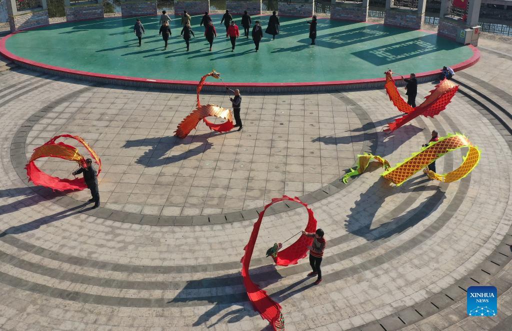 Local residents practice dragon dance at Xingfu Park in Chongchuan District of Nantong City, east China's Jiangsu Province, Dec. 18, 2021. [Photo/Xinhua]