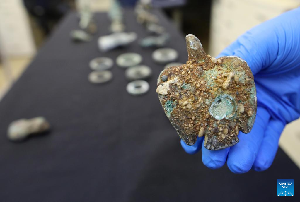 An artifact found from an ancient shipwreck in the Mediterranean Sea, is displayed at the Israel Antiquities Authority lab in Jerusalem on Dec. 22, 2021. Israeli marine archaeologists have found some rare treasure from two ancient shipwrecks in the Mediterranean Sea, the Israel Antiquities Authority (IAA) said on Wednesday. [Photo by Gil Cohen Magen/Xinhua]