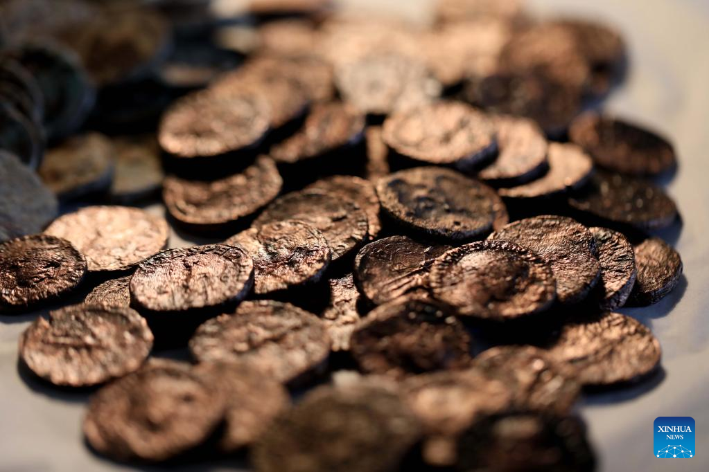 E-mail Xinhua, December 23, 2021Photo taken on Dec. 22, 2021 shows coins found from ancient shipwrecks in the Mediterranean Sea, on display at the Israel Antiquities Authority lab in Jerusalem. Israeli marine archaeologists have found some rare treasure from two ancient shipwrecks in the Mediterranean Sea, the Israel Antiquities Authority (IAA) said on Wednesday. [Photo by Gil Cohen Magen/Xinhua]