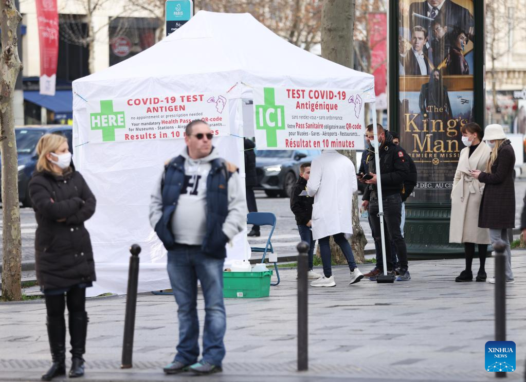 People line up in front of a fast COVID-19 tests tent near the Arc de Triomphe in Paris, France, Dec. 23, 2021. [Photo by Gao Jing/Xinhua]