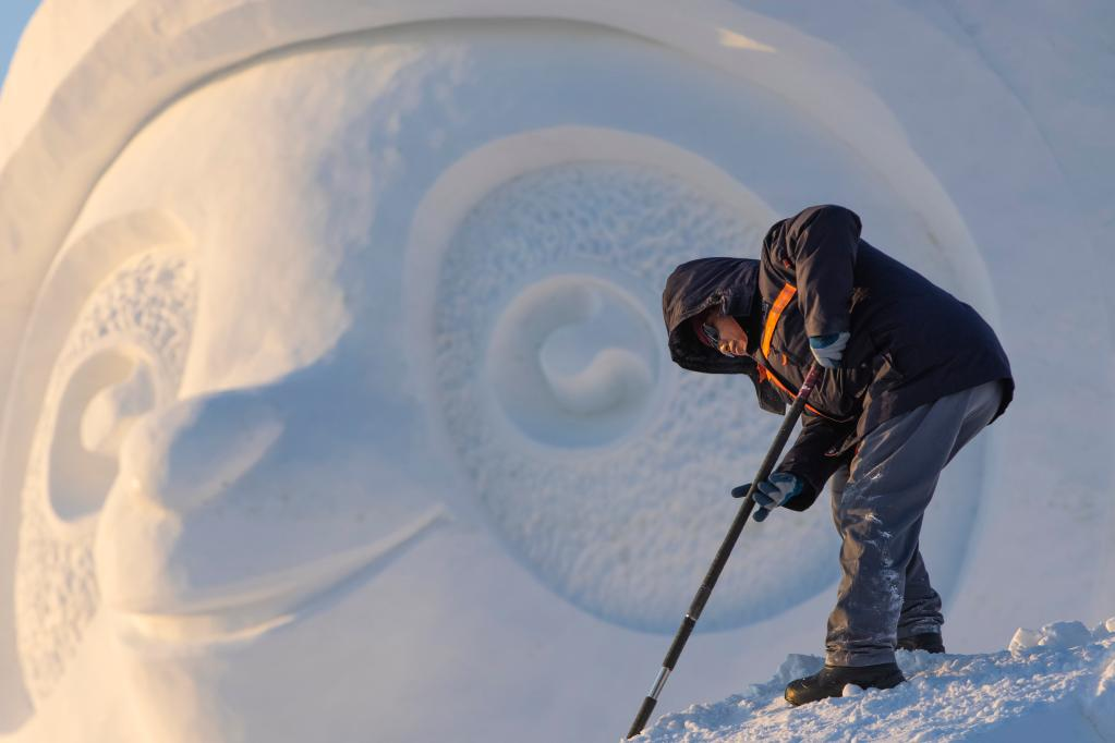 E-mail Xinhua, December 29, 2021A worker finishes the main snow sculpture featuring Beijing 2022 mascots at the 34th Harbin Sun Island International Snow Sculpture Art Exposition in Harbin, northeast China's Heilongjiang Province, Dec. 27, 2021. [Photo by Zhang Tao/Xinhua]