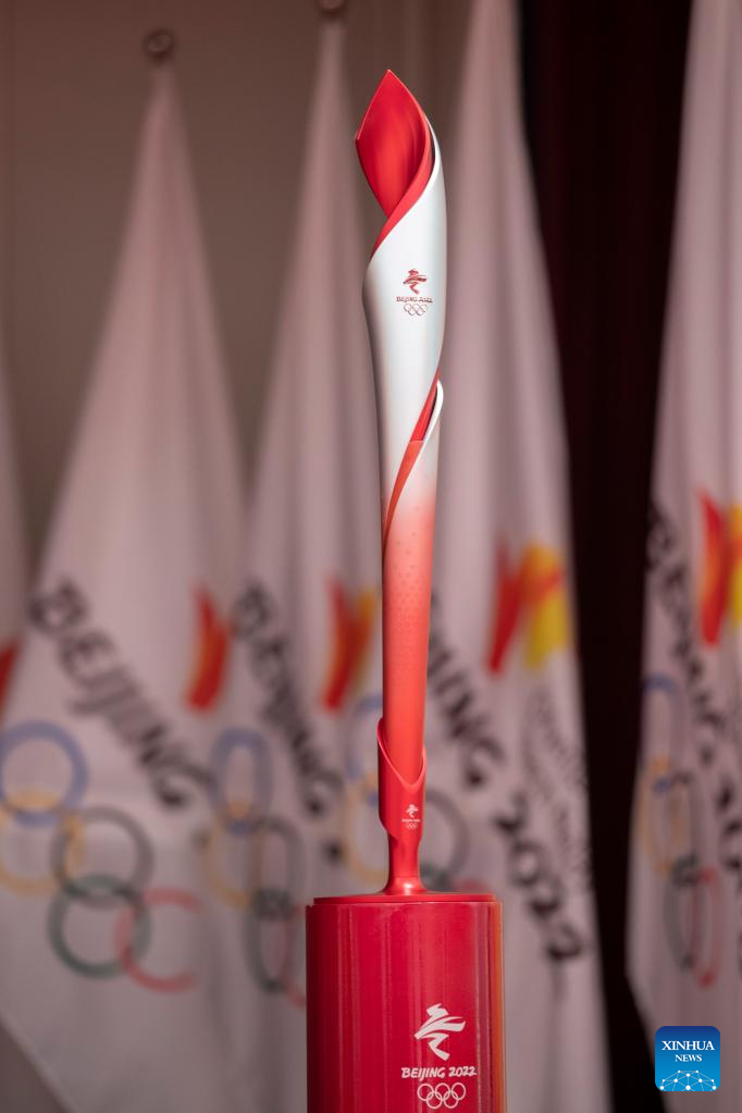 The torch is seen during the Torch Exhibition Tour of Olympic Winter Games Beijing 2022 in Harbin, northeast China's Heilongjiang Province, Jan. 5, 2022. [Photo by Zhang Tao/Xinhua]