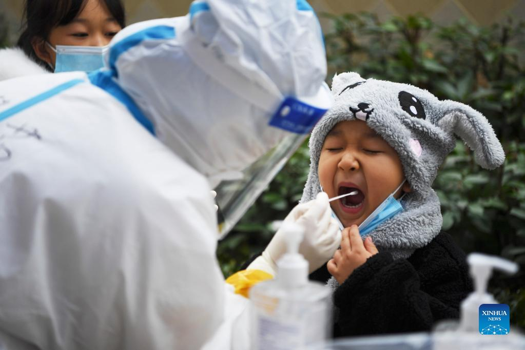 E-mail Xinhua, January 11, 2022A medical worker takes a swab sample from a child for nucleic acid test at a COVID-19 testing site in Zhengzhou, central China's Henan Province, Jan. 10, 2022. Henan on Sunday reported 60 new locally transmitted COVID-19 cases, the National Health Commission said in its daily report on Monday. [Photo by Zhang Haoran/Xinhua]