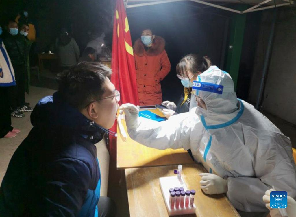E-mail Xinhua, January 11, 2022A medical worker takes a swab sample from a resident for nucleic acid test at a COVID-19 testing site in Baoliansi Township of Wenfeng District in Anyang, central China's Henan Province, Jan. 10, 2022. Henan on Sunday reported 60 new locally transmitted COVID-19 cases, the National Health Commission said in its daily report on Monday. [Photo/Xinhua]