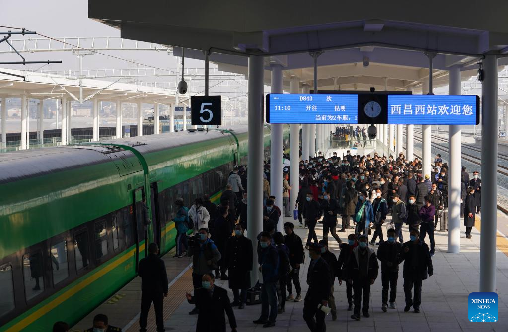 Passengers are seen at Xichang West Railway station in Xichang, Liangshan Yi Autonomous Prefecture, southwest China's Sichuan Province, Jan. 10, 2022.[Photo by Jiang Hongjing/Xinhua]