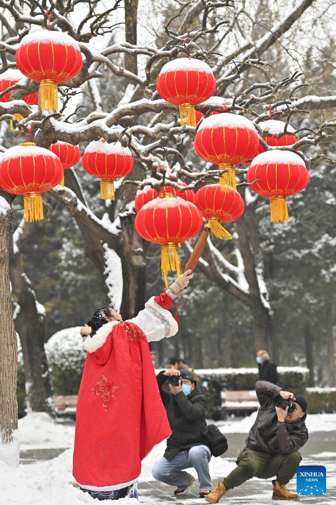A tourist poses for photos amid snow at Jingshan Park in Beijing, capital of China, Jan. 22, 2022. (Xinhua/Li Xin)