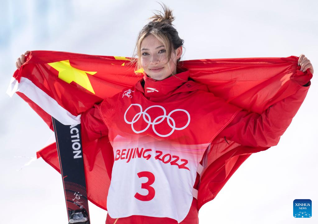 E-mail Xinhua, February 15, 2022Gu Ailing of China celebrates during flower ceremony after the freestyle skiing women's freeski slopestyle final of Beijing 2022 Winter Olympics at Genting Snow Park in Zhangjiakou, north China's Hebei Province, Feb. 15, 2022. [Photo by Xiao Yijiu/Xinhua]