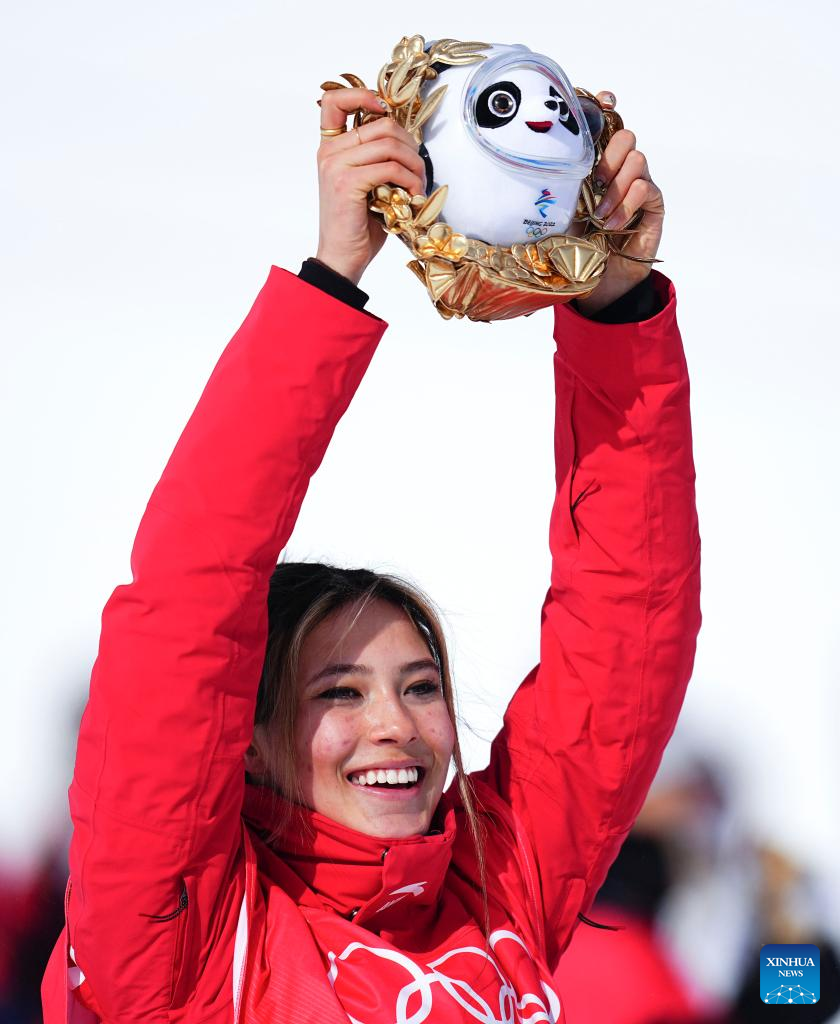 E-mail Xinhua, February 15, 2022Gu Ailing of China celebrates during flower ceremony after the freestyle skiing women's freeski slopestyle final of Beijing 2022 Winter Olympics at Genting Snow Park in Zhangjiakou, north China's Hebei Province, Feb. 15, 2022. [Photo by Xu Chang/Xinhua]
