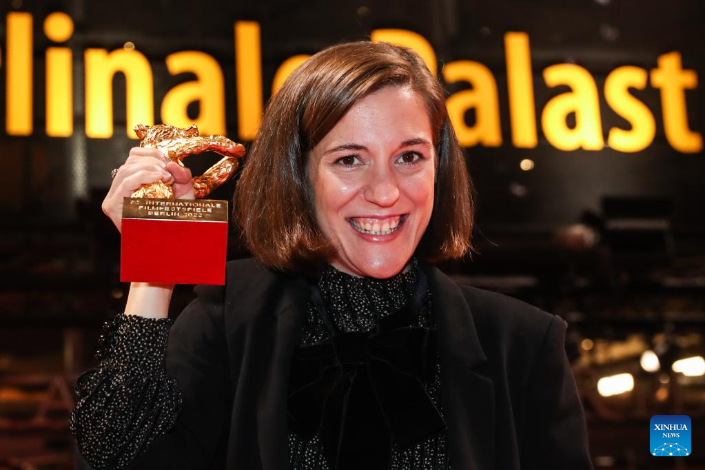E-mail Xinhua, February 17, 2022Carla Simon, director of the film "Alcarras", poses for photos after receiving the Golden Bear during the 72nd Berlin International Film Festival in Berlin, capital of Germany, Feb. 16, 2022. (Xinhua/Shan Yuqi)