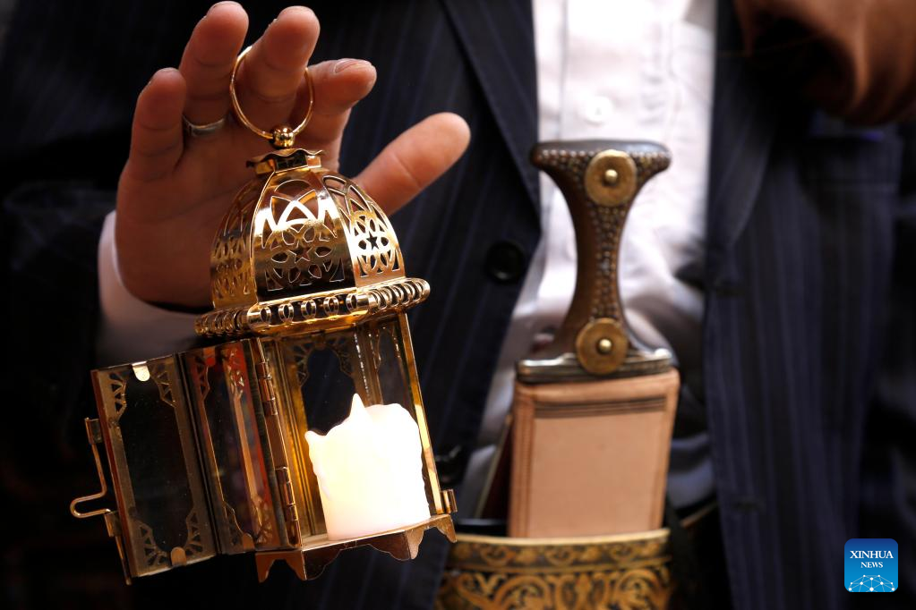 A man shows a decorative lantern at a market ahead of the upcoming Ramadan in Sanaa, Yemen, on March 31, 2022. [Photo by Mohammed Mohammed/Xinhua]