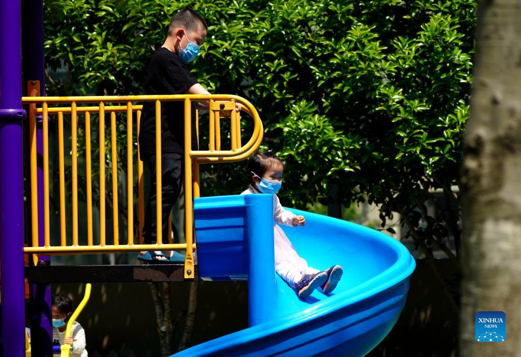 Children play at a community in Songjiang District of east China's Shanghai, April 12, 2022. Shanghai has divided the whole city into areas belonging to three categories as part of targeted efforts to overcome a local COVID-19 resurgence. It has designated 7,624 closed-off management areas, 2,460 restrictive control areas and 7,565 prevention areas, according to a press conference held on Monday. [Photo by Zhang Jiansong/Xinhua]