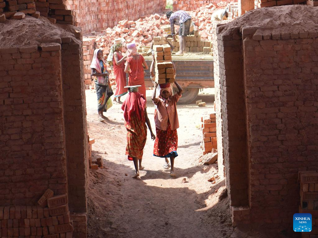 Laborers work at a brick field on International Labor Day in the outskirts of Agartala, the capital city of India's northeastern state of Tripura, May 1, 2022. [Photo/Xinhua]