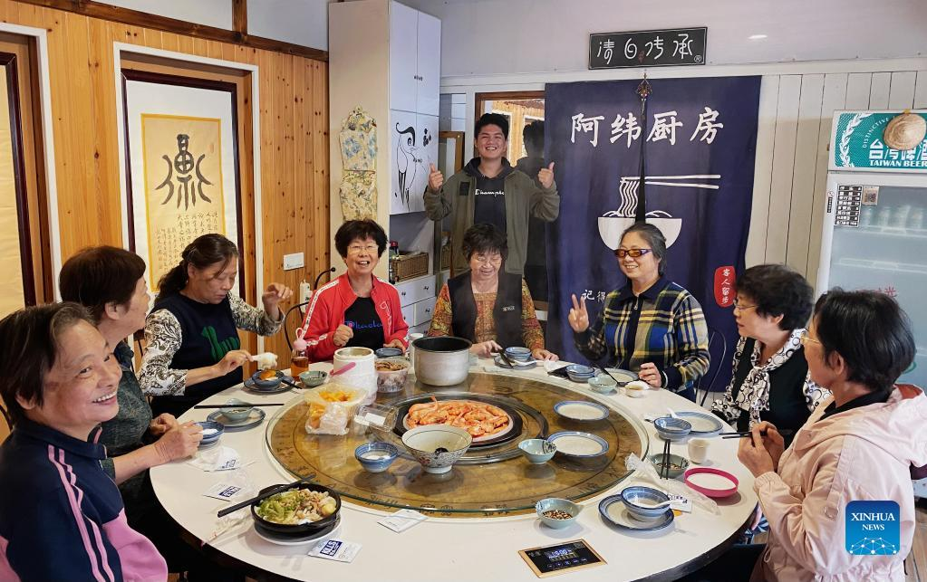 Chen Wayne (back) poses for a photo with customers at his family restaurant in Xiamen, southeast China's Fujian Province, May 2, 2022. (Xinhua/Wei Peiquan)