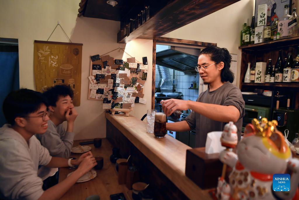 Wang Shengfen makes beverages at his "late night canteen" in Xiamen, southeast China's Fujian Province, May 1, 2022. (Xinhua/Wei Peiquan)