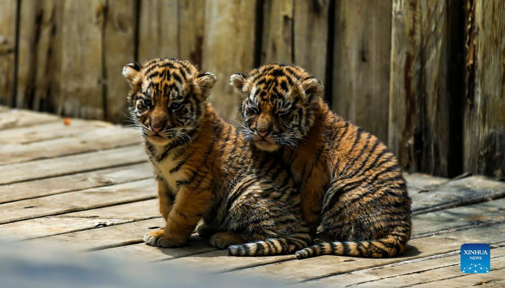 Siberian tiger cubs play at Yunnan Wild Animal Park in Kunming, southwest China's Yunnan Province, May 3, 2022. The one-month-old Siberian tiger quadruplets greet visitors at Yunnan Wild Animal Park during the Labor Day holiday. (Xinhua/Jiang Wenyao)