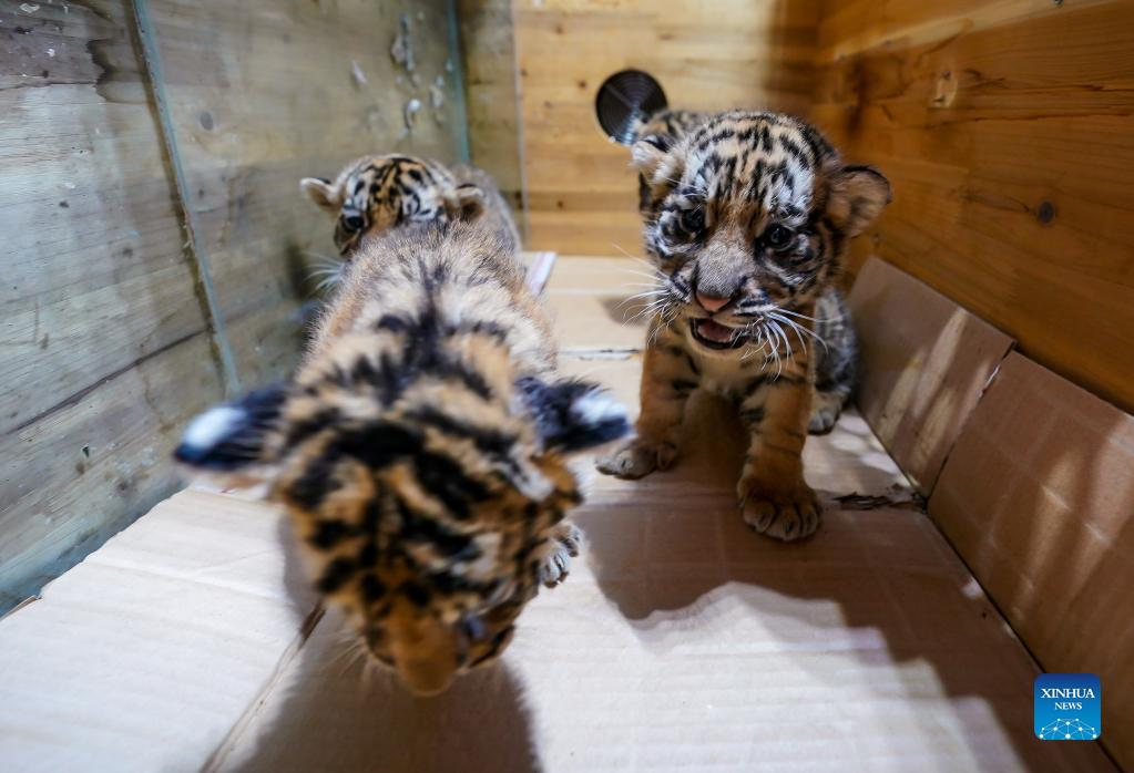 E-mail Xinhua, May 4, 2022Siberian tiger cubs rest at Yunnan Wild Animal Park in Kunming, southwest China's Yunnan Province, May 3, 2022. The one-month-old Siberian tiger quadruplets greet visitors at Yunnan Wild Animal Park during the Labor Day holiday. (Xinhua/Jiang Wenyao)