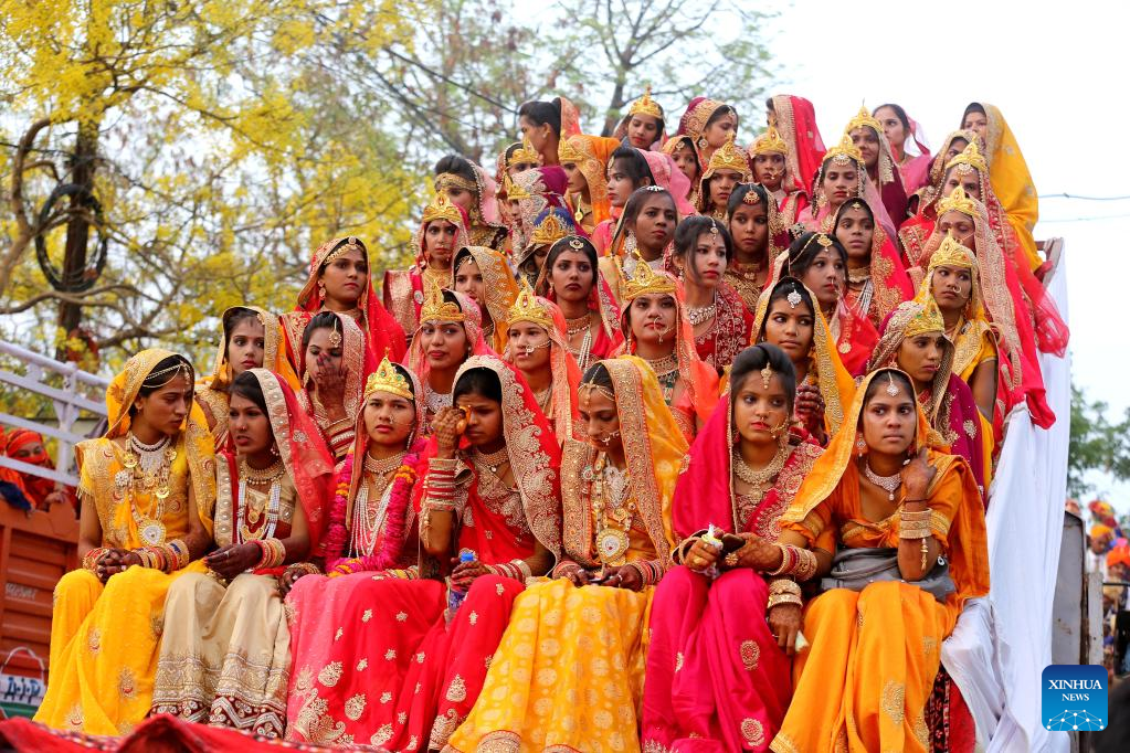 Brides take part in a mass wedding in Bhopal, capital of India's Madhya Pradesh state, May 3, 2022. More than 52 couples on Tuesday tied the nuptial knot during the mass wedding in Bhopal. (Str/Xinhua)