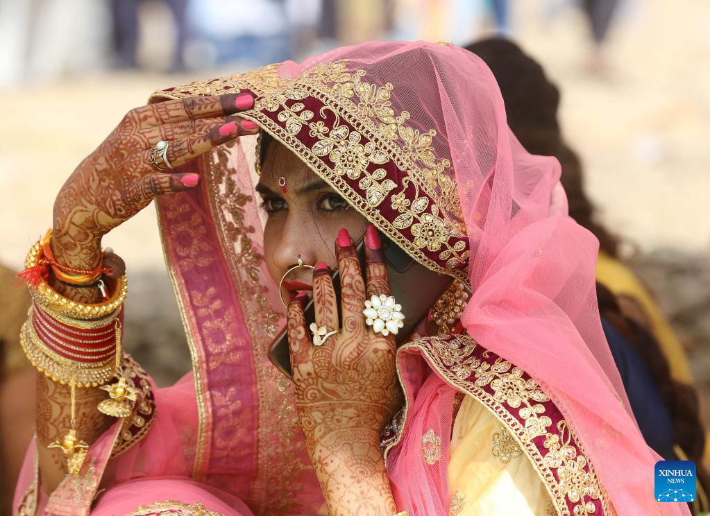 A bride talks on a phone as she takes part in a mass wedding in Bhopal, capital of India's Madhya Pradesh state, May 3, 2022. More than 52 couples on Tuesday tied the nuptial knot during the mass wedding in Bhopal. (Str/Xinhua)