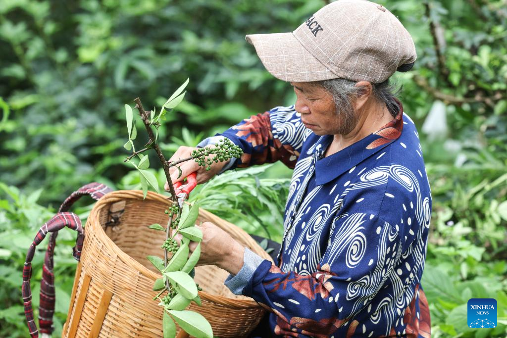 A villager harvests Sichuan pepper in Zhennan Town of Wuchuan Gelao and Miao Autonomous County, southwest China's Guizhou Province, June 16, 2022. [Photo by Ou Dongqu/Xinhua]