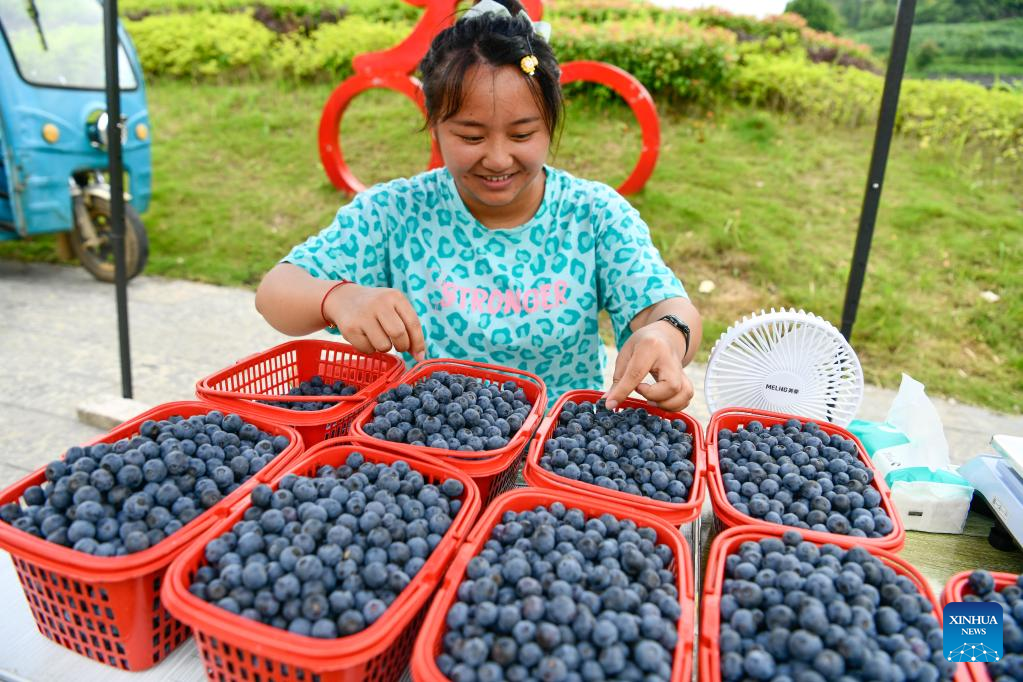 E-mail Xinhua, June 21, 2022A villager sells blueberries at an ecological blueberry garden in Majiang County, southwest China's Guizhou Province, June 18, 2022. More than 80,000 mu (about 5,333 hectares) of blueberries have entered harvest season in Majiang County of Guizhou, and the blueberry products are being sold to the rest of the country via online orders. (Xinhua/Yang Wenbin)
