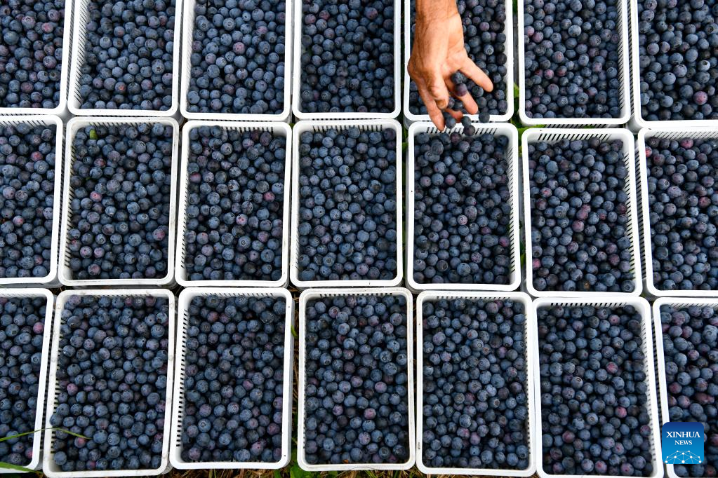 E-mail Xinhua, June 21, 2022Photo shows blueberries collected at an ecological blueberry garden in Majiang County, southwest China's Guizhou Province, June 18, 2022. More than 80,000 mu (about 5,333 hectares) of blueberries have entered harvest season in Majiang County of Guizhou, and the blueberry products are being sold to the rest of the country via online orders. (Xinhua/Yang Wenbin)