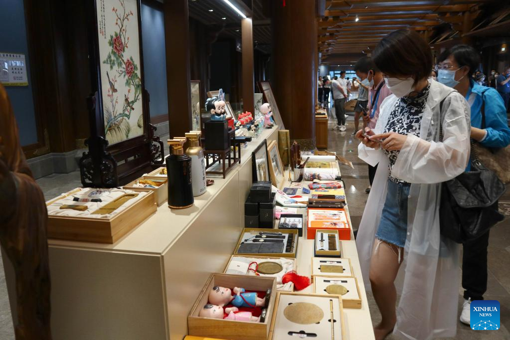 Visitors look at various products during a culture and tourism commodities fair in Qufu of Jining, east China's Shandong Province, June 27, 2022. A culture and tourism commodities fair to promote culture and tourism industry in Shandong Province is held here Monday. (Xinhua/Xu Suhui)