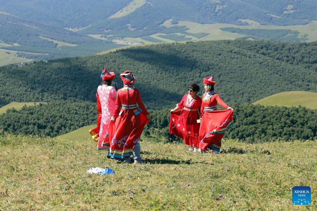 Tourists pose for photos at a forest park in Bashang area of Fengning Manchu Autonomous County, north China's Hebei Province, Aug. 5, 2022. (Xinhua/Luo Xuefeng)