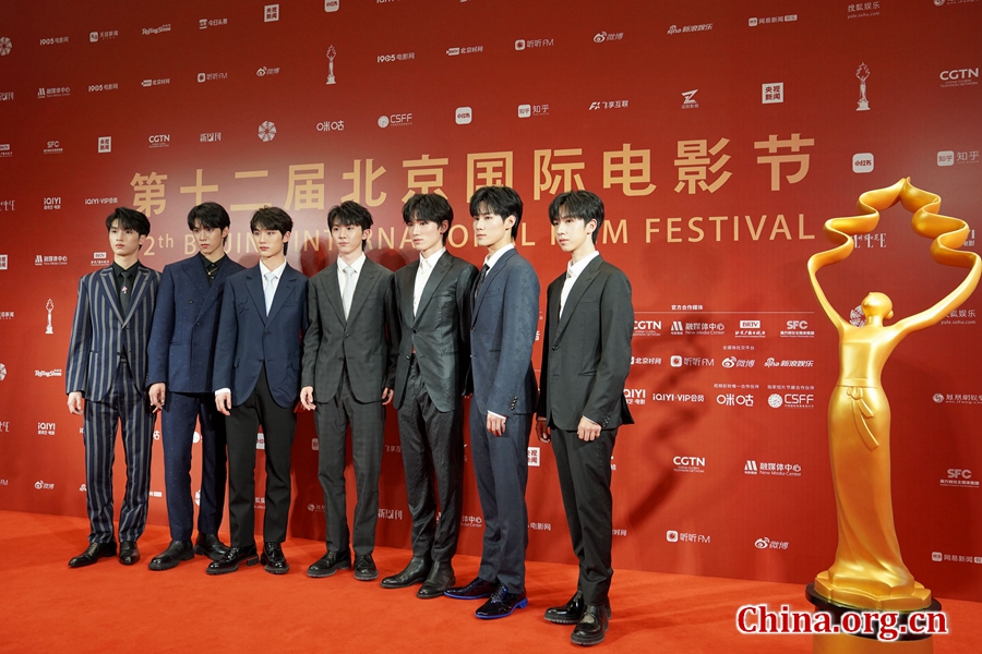 Boy band Teens in Times, who performed at the opening ceremony, pose for a photocall on the red carpet of the 12th BJIFF on Aug. 12, 2022. [Photo by Wang Yiming/China.org.cn]