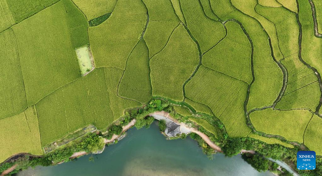 Aerial Photo taken on Aug. 27, 2022 shows the view of paddy fields in Matou Village of Hefeng Township, Kaiyang County in Guiyang, capital city of southwest China's Guizhou Province. (Xinhua/Yang Ying)